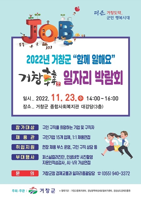 경남 거창군은 오는 23일 거창군종합사회복지관 3층 대강당에서 '함께 일해요! 2022년 거창韓 일자리 박람회'를 개최한다.