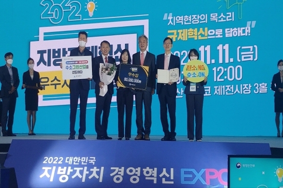 울산시가 11일 부산 벡스코에서 개최된 ‘2022년 지방규제혁신 우수사례 경진대회’에서 ‘수소 이동수단(모빌리티) 실증·기준 마련으로 수소 친환경(그린)산업을 선도하다’라는 과제로 우수상을 수상했다고 밝혔다.