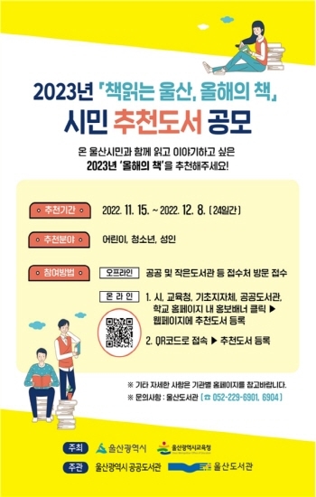 이번 시민 추천 도서 공모는 울산시민이면 누구나 가능하며 11월 15일부터 12월 8일까지 공공도서관에 방문해 추천서를 직접 작성하거나 도서관 누리집을 통해 온라인 접수하면 된다.