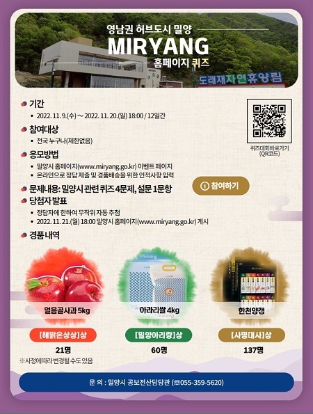 밀양시 홈페이지 퀴즈 이벤트는 시정홍보와 관광지, 우수 농산물 등을 널리 알리기 위해 실시된다. 퀴즈 참여는 밀양시 홈페이지에 접속해 이벤트 페이지에 있는 객관식 4문항과 설문형태의 주관식 1문항의 답을 입력한 후 제출하면 된다.
