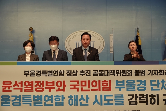 민주당 부울경 시당위원장은 14일 국회에서 기자회견을 열고 "윤석열 정부와 국민의힘 부울경 단체장의 부울경특별연합 해산 시도를 강력히 규탄한다"고 목소리를 높였다.