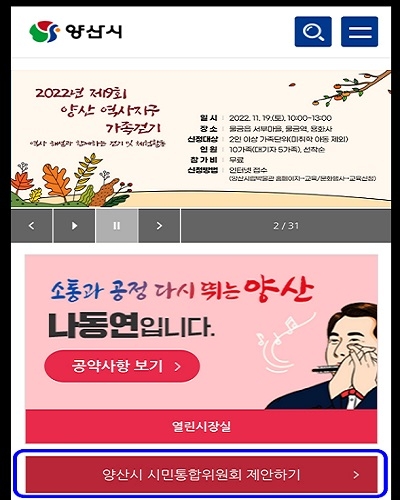 시민통합위로의 제안 방법은 시 홈페이지 게시판을 이용하거나, 제안서식을 다운받아 양산시 기획예산담당관실(중앙로 39) 또는 이메일로 제출하면 된다.