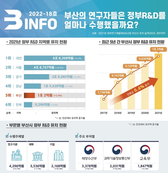 보고서에 따르면 2021년도 시의 정부 R&D사업 국비 유치액은 1조 2억원으로 집계됐다. 이는 2020년보다 3.9% 늘어난 것이다. 부산시는 대전, 서울, 경기, 경남에 이어 전국 광역지자체 중 5위에 올랐다. 부산시 정부 R&D 유치금액은 지난 5년간(2017년~2021년) 연평균 6.4%씩 꾸준히 증가하고 있다.