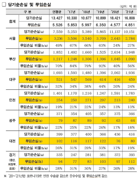 특히, 부산의 경우 13개 지자체 중 연평균 무임손실 비율이 70%로 가장 높다.