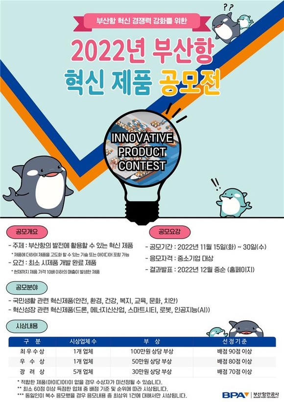부산항만공사(BPA)는 오는 30일까지 '2022년 부산항 혁신 제품 공모전'을 개최한다고 16일 밝혔다.