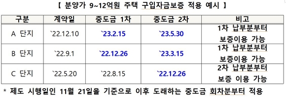 특히, 신규 분양계약뿐만 아니라 이미 분양계약을 체결한 경우에도 제도 시행 이후 도래하는 중도금 회차분에 대해서는 분양가 12억원을 기준으로 보증을 이용할 수 있다.