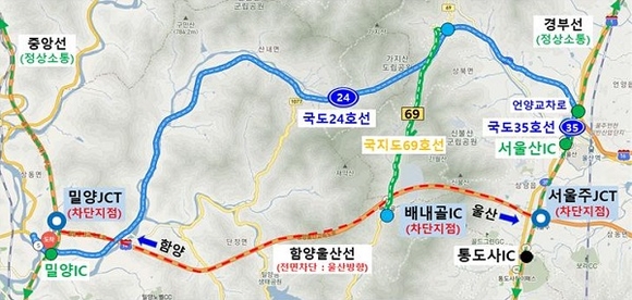 이번 훈련을 위해 24일 오후 1시부터 5시까지 함양울산고속도로 울산방향 밀양JCT~서울주JCT 구간을 전면차단하고, 함양방향으로는 일부 구간 1차로가 차단된다. 이 구간을 지나는 차량은 밀양IC → 국도24호선 → 언양교차로 → 국도35호선 → 서울산IC 우회도로를 이용할 수 있다.