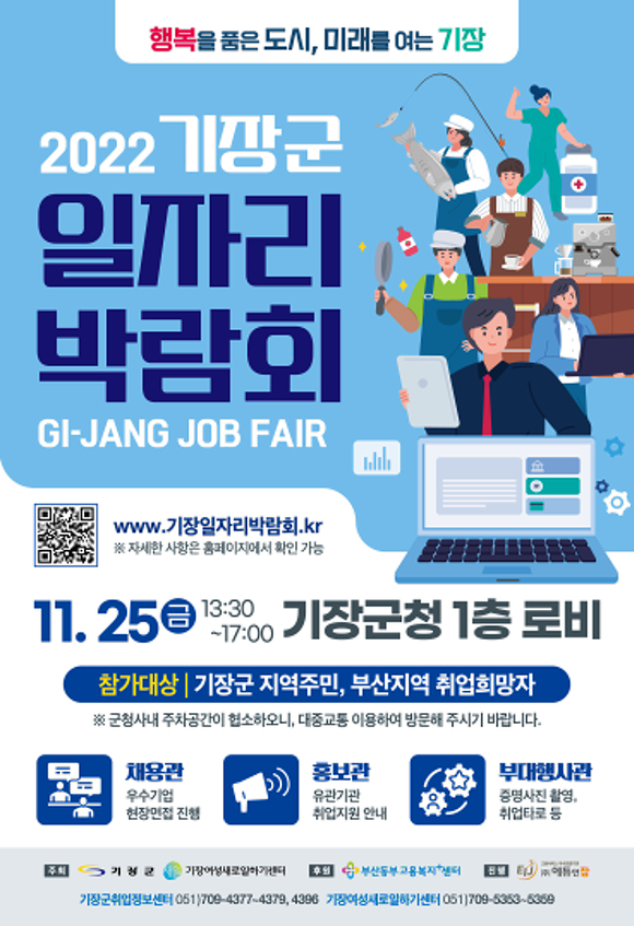 부산 기장군은 오는 25일 오후 1시 30분부터 오후 5시까지 군청 로비에서 '2022년 기장군 일자리박람회'를 개최한다고 밝혔다.