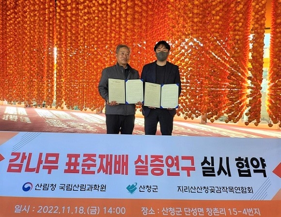 18일 산청군에 따르면 산림청 국립산림과학원 산림특용자원연구과와 산청 단성면에서 감 재배와 곶감을 생산하고 있는 백한흠 농가가 곶감 산업 활성화를 위한 시험 재배 실시협약을 체결했다.