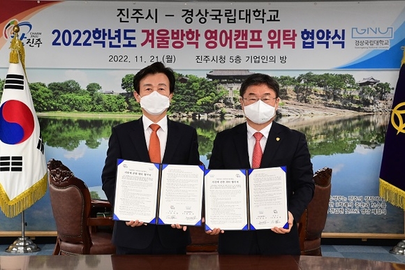 경남 진주시와 경상국립대학교는 21일 시청 기업인의 방에서 '2022학년도 겨울방학 영어캠프 위탁 협약식'을 가졌다.
