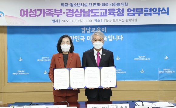 경남도교육청은 여성가족부와 21일 오전 도교육청에서 학교와 청소년시설 간 연계·협력 강화를 위한 업무협약을 체결했다.
