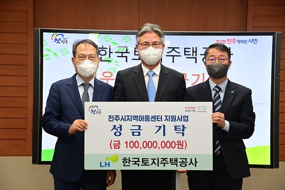 한국토지주택공사(LH) 국토도시개발본부는 21일 진주시청 5층 상황실에서 지역 내 소외계층 아동들의 지원을 위한 성금 1억 원을 진주시복지재단에 기탁했다.