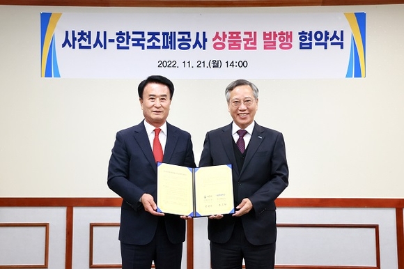 경남 사천시와 한국조폐공사는 21일 시청 시장실에서 박동식 시장, 반장식 공사 사장 등이 참석한 가운데 사천사랑상품권 발행을 위한 업무협약을 체결했다.