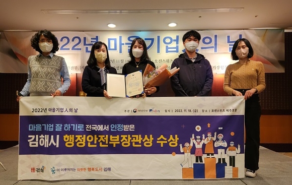 경남 김해시는 지난 18일 제주에서 열린 '2022년 마을기업인의 날'에서 마을기업 육성 및 활성화 유공을 인정받아 행정안전부 장관상을 수상했다고 21일 밝혔다.