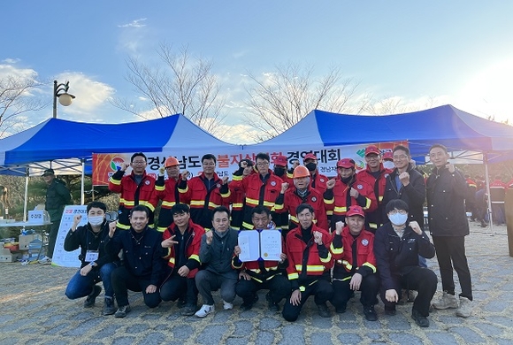 경남 산청군 산불전문예방진화대원들이 경남산불지상진화 경연대회에서 우수한 성적으로 최우수상을 수상했다.