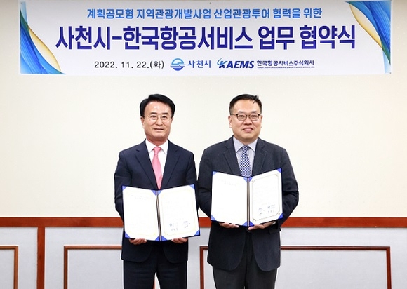 시는 22일 시청 시장실에서 한국항공서비스(KAEMS)와 '사천시 계획공모형 지역관광개발사업'의 핵심 콘텐츠인 산업관광 투어의 원활한 추진과 운영을 위한 업무협약식을 가졌다.
