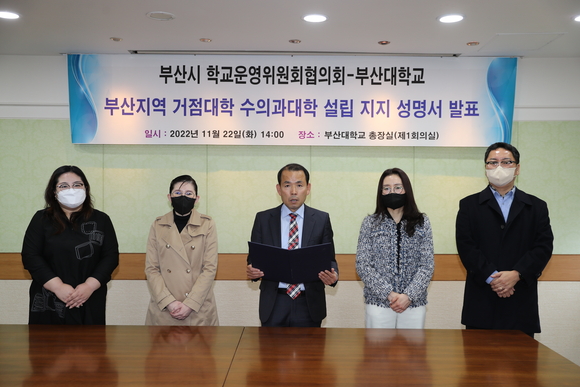 부산대학교는 22일 부산시 학교운영위원회협의회가 부산대 총장실을 방문해 '부산지역 거점대학 수의과대학 설립 지지 성명서'를 발표했다고 밝혔다.