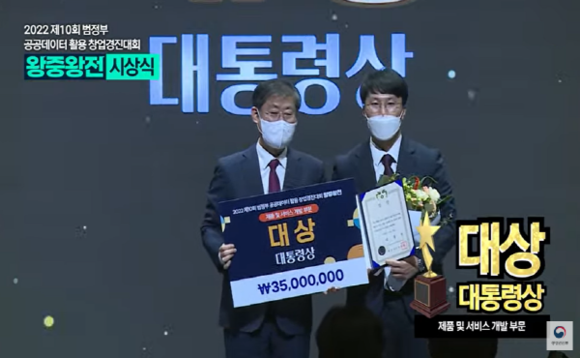 울산시는 행정안전부에서 주최한 ‘제10회 범정부 공공데이터 활용 창업경진대회 왕중왕전’에서 울산 대표로 출전한 ㈜에이테크가 대상(대통령상)을 수상했다고 23일 밝혔다.