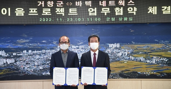 경남 거창군은 23일 군청 상황실에서 구인모 군수, 노창준 바텍 네트웍스 회장이 참석한 가운데 상생사업인 이음프로젝트 추진을 위한 업무협약을 체결하고 사업추진을 본격화 했다.