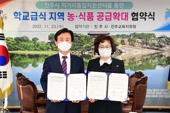 경남 진주시는 진주교육지원청과 23일 시청 기업인의 방에서 학교급식에 지역에서 생산되는 우수한 농·식품 공급을 확대하기 위한 업무협약을 체결했다.