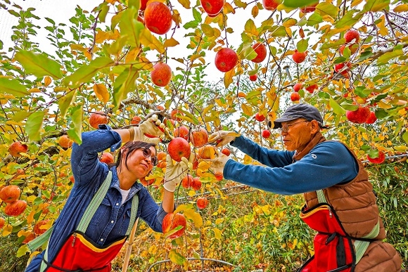 24일 경남 산청군 삼장면 딱바실농원에서 작업자들이 사과를 수확하고 있다. 산청은 해발고도가 높아 일교차가 큰 탓에 당도가 높고 식감이 우수한 사과를 생산하는데 최적지로 손꼽힌다. (사진=산청군 제공)