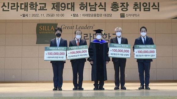 특히 이날 취임식에서 신라대 인재 육성과 교육 인프라 확충을 위해 세운철강㈜ 신정택 회장, 은산해운항공㈜ 양재생 회장, 경동건설㈜ 김정기 대표이사, ㈜와이씨텍 박수관 회장이 1억 원씩 쾌척하는 등 총 5억 원의 발전기금을 전달하는 기탁식도 함께 가졌다.