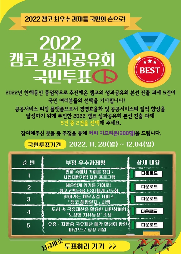 온라인 국민투표는 캠코 홈페이지 내 '공지사항'을 통해 누구나 참여할 수 있으며, 참여자 중 300명을 추첨해 커피 기프티콘을 증정할 계획이다.