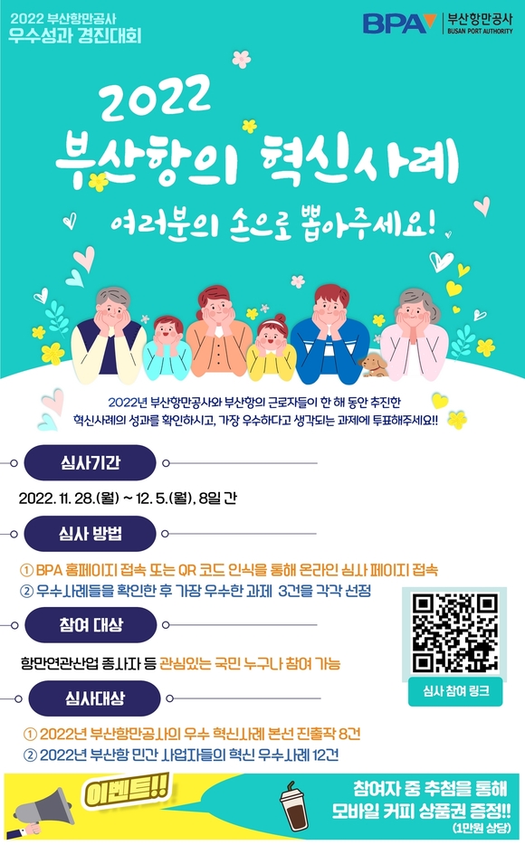 부산항만공사(BPA)는 오는 12월 5일까지 '2022년 부산항 혁신 우수사례 국민심사' 온라인 투표를 진행한다고 28일 밝혔다.