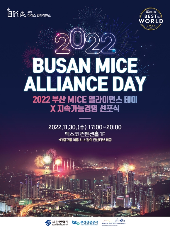 부산관광공사는 30일 벡스코 컨벤션홀에서 '2022년 부산 MICE 얼라이언스 데이×지속가능경영 선포식'을 개최한다고 밝혔다