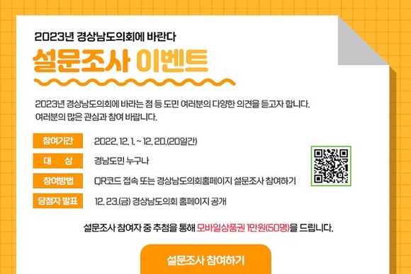 이번 도민 인식조사는 '2023년 경상남도의회에 바란다'라는 주제로 1일부터 20일까지 진행되며, 도의회 누리집 홍보 배너 내 QR코드를 통해 도민 누구나 참여할 수 있다.
