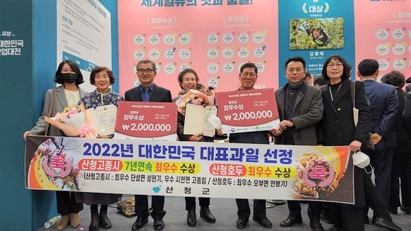 산청군은 2일 대구 엑스코에서 열린 '2022 대한민국 대표과일 선발대회'에서 성현기(71·단성면)씨가 출품한 고종시와 민병기(70·오부면)씨가 출품한 호두가 농림축산식품부장관상(최우수상)을 수상했다고 밝혔다.