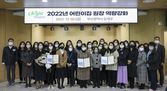 부산 강서구는 지난 2일 강서구 육아종합지원센터에서 2022년 보육사업 유공자에 대한 표창을 수여하고 관내 어린이집 원장 역량강화를 위한 교육을 실시했다고 밝혔다. 사진은 김형찬 강서구청장(왼쪽)과 참석자들이 기념촬영을 하고 있는 모습.(사진=강서구 제공)