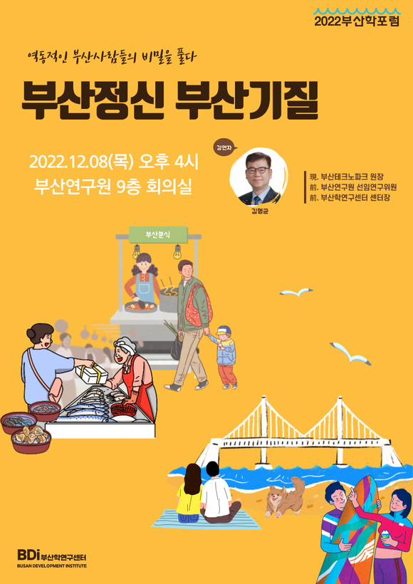 부산연구원 부산학연구센터는 오는 8일 오후 4시 연구원 9층 회의실에서 '부산정신, 부산기질'을 주제로 부산학포럼을 개최한다고 6일 밝혔다.