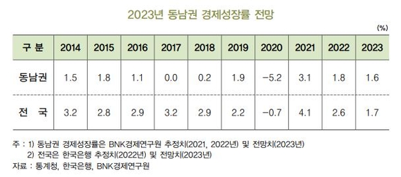 BNK금융그룹 소속 BNK경제연구원이 8일 발표한 '2023년 동남권 경제전망' 연구보고서에 따르면, 올해에 이어 2년 연속 1%대의 미약한 성장에 그치면서 지역경제 활력 회복이 지연될 것으로 예상했다.