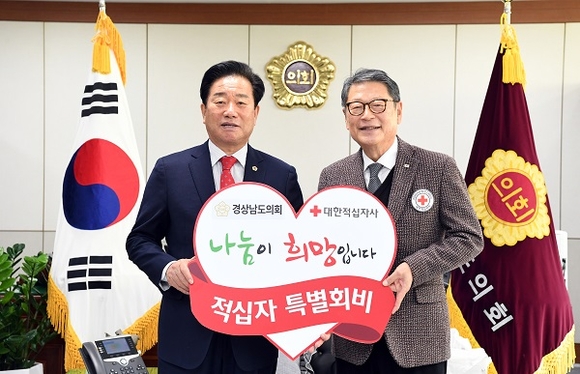 경남도의회 김진부 의장은 8일 도의회에서 2023년 대한적십자사 특별회비 전달식을 갖고, 대한적십자사 경남지사에 특별회비 100만원을 전달했다.