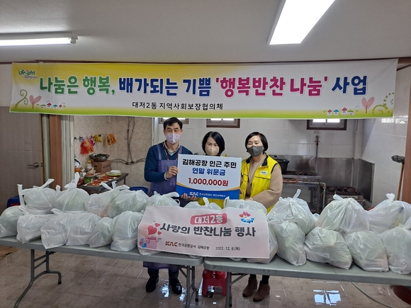 한국공항공사 김해공항은 8일 연말을 맞아 공항주변 소음대책(인근)지역 취약계층 위문행사를 실시했다고 밝혔다. 이날 김해공항은 대저2동 행정복지센터, 대한노인회 김해지사 등에 위문금 총 300만원을 전달하고, 대저2동 지역사회보장협의체에서 매 달 실시하는 '행복반찬 나눔사업'에도 직접 참여했다.
