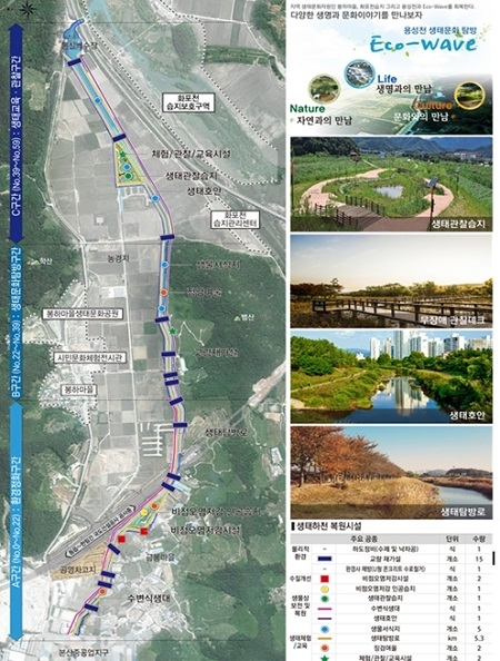 ▲용성천 생태하천복원사업= 진영읍 본산리 일원 용성천 생태하천 복원사업은 하천기본계획 수립을 완료하고 현재 실시설계용역 막바지 단계에 있다. 용성천은 종점부가 국가습지보호구역인 화포천과 연결된 하천으로 본산준공업단지와 인근 농경지에서 발생한 오염물질로 인해 4등급 수질의 오염수가 화포천으로 바로 유입되고 있어 수질 개선이 시급한 실정이다.