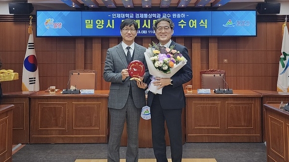 경남 밀양시는 13일 경제, 산업, 문화 등 다방면에서 밀양시 발전에 기여한 공이 큰 원종하 인제대학교 경제통상학과 교수를 명예시민으로 선정해 시청 소회의실에서 명예시민증을 수여했다.