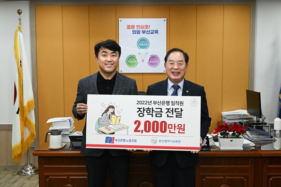 BNK부산은행 노동조합은 지난 14일 부산시교육청에서 지역 소외계층 가정의 중·고등학생을 위해 장학금 2000만원을 전달했다고 밝혔다.