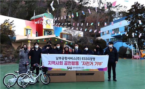 한국공항공사 자회사 남부공항서비스는 지역사회 공헌활동으로 지난 14일 아동보육시설인 소양무지개동산에 200만원 상당의 아동용 자전거를 기부했다고 밝혔다. 이번 기부활동은 남부공항서비스에서 추진하는 ESSG(환경・안전・사회・지배구조)경영의 일환으로 사회적가치 실현의 책임을 다하고자 진행됐다. 향후에도 활발한 ESSG경영 활동을 통해 사회적 책임을 다하고자 노력할 예정이다.