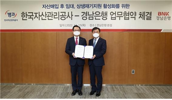 한국자산관리공사(캠코)와 경남은행 본점은 15일 '자산매입 후 임대프로그램(S&LB)을 활용한 상생재기지원 촉진 프로그램 업무협약'을 체결했다고 밝혔다.
