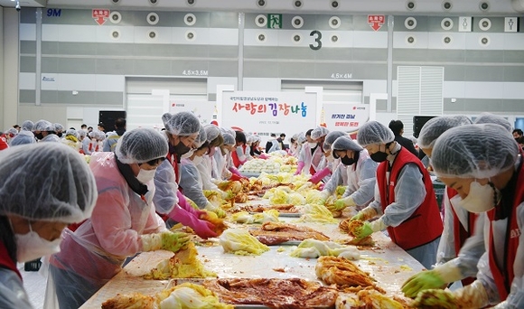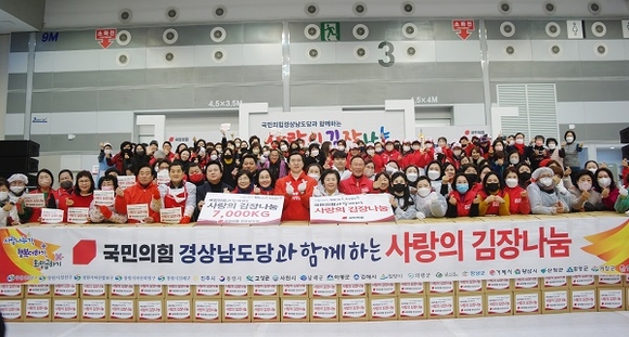 국민의힘 경남도당은 19일 오전 창원컨벤션센터 제3전시장에서 도내 국회의원·당협위원장 및 배우자, 안철수 의원, 김기현 의원 배우자 및 당원 400여명이 참여한 가운데 '사랑의 김장나눔'을 펼쳤다. 이날 담근 김치 7천㎏은 경남 시·군·구청을 통해 독거노인, 장애인, 아동·청소년, 다문화 가정 등 소외계층에게 전달될 예정이다. (사진=국민의힘 경남도당 제공)