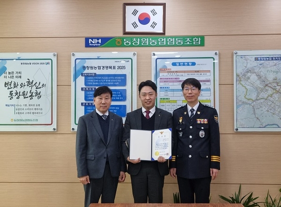 동창원농협은 남산지점 최한빈 계장의 고객에 대한 각별한 관심으로 신종 금융사기 피해로부터 고객의 소중한 자산을 지켜내 창원서부경찰서로부터 21일 감사장을 받았다고 밝혔다.