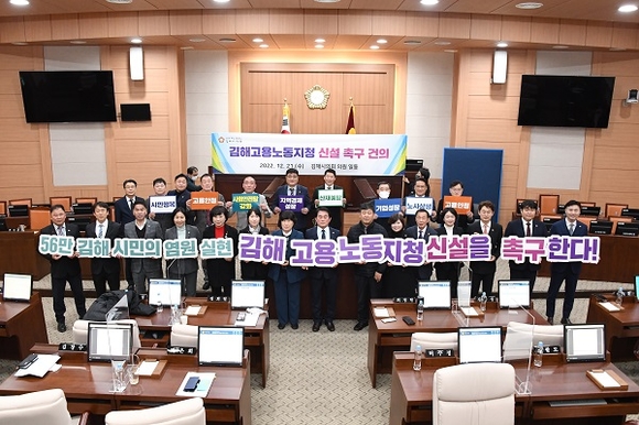 건의안에는 김해시의 고용 및 노사관계 안정, 23만 일하는 시민의 안전한 일터 조성과 지역경제 활성화 견인을 위해 김해 지역을 단독으로 관할하는 김해고용노동지철 신설을 조속한 추진을 촉구하는 내용을 담고 있다.