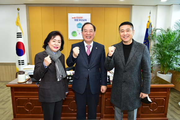 하윤수 부산시교육감(가운데)이 23일 전 롯데자이언츠 박정태 선수(오른쪽)와 면담하고 기념촬영을 하고 있다.(사진=부산시교육청 제공)