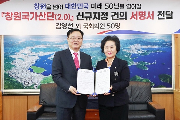 경남 창원시는 26일 김영선 의원(창원시 의창구)이 '창원국가산단(2.0)' 신규 지정을 위한 국회의원 51명의 건의 서명서를 홍남표 시장에게 전달했다고 밝혔다.