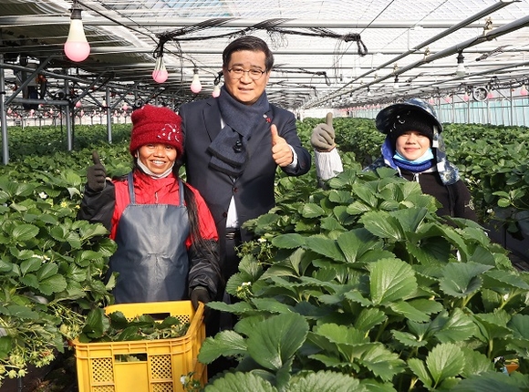 진병영 군수는 크리스마스인 이날 계절근로자들이 일하는 현장을 찾아 애로사항을 듣는 것은 물론 숙소를 둘러보며 한파 속 건강관리에도 각별한 주의를 당부했다.
