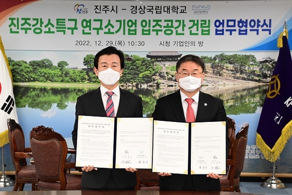 조규일 진주시장과 권순기 경상국립대 총장은 29일 경남진주강소특구 연구소기업 입주공간 건립을 위한 진주시와 경상국립대 업무협약식을 가졌다.