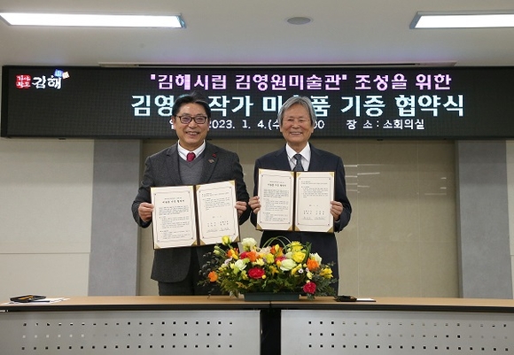 경남 김해시는 4일 시청 소회의실에서 '김해시립 김영원미술관' 조성을 위한 미술품 기증 협약식을 가졌다.