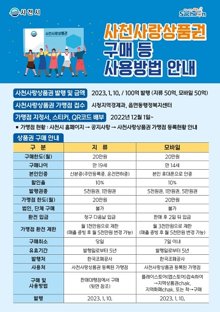 사천사랑상품권의 발행 규모는 지류 50억 원, 모바일 50억 원 등 총 100억 원이며, 종이 상품권은 2종(5천원권, 1만원권), 모바일 상품권은 3종(5천원권, 1만원권, 5만원권)이 발행된다.